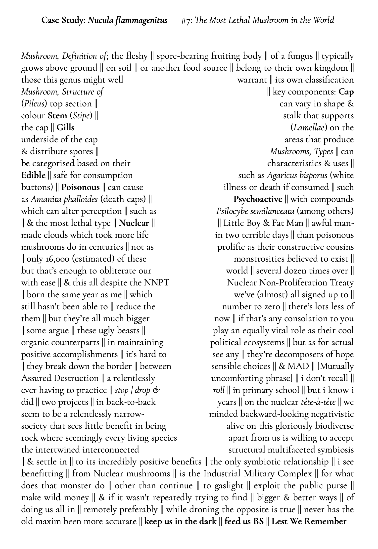 Lethal Prejudice (today’s two-worder grab) sounds like the title of a terrible Jean Claude van Damme action movie. It’s not. But it is a shape poem (or indeed, an anti-shape poem) about the world’s most lethal mushroom. A relatively easy choice when Anzac/war etc + mushrooms turned up very few hits.